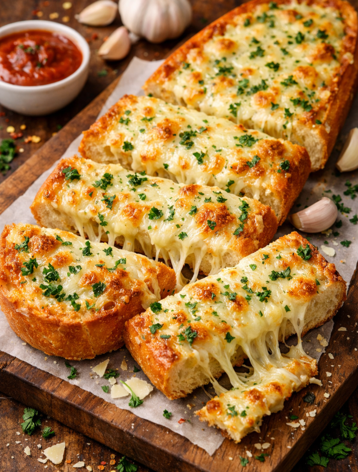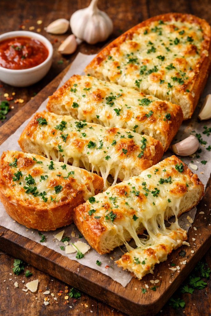 Cheesy garlic bread is one of those comfort foods that never fails. It’s the perfect mix of crunchy bread, buttery garlic flavor, and stretchy melted cheese. Restaurants often serve it as a side with pasta, but honestly, it’s so good it could easily be the star of the meal.