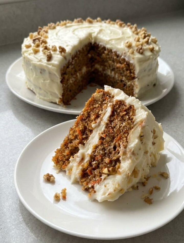 Carrot cake is one of the rare bakes that improves with age. The moisture from the carrots continues to hydrate the crumb over 24 hours. Store in an airtight container in the fridge. For the best flavor, take it out 20 minutes before serving to let the frosting soften slightly.