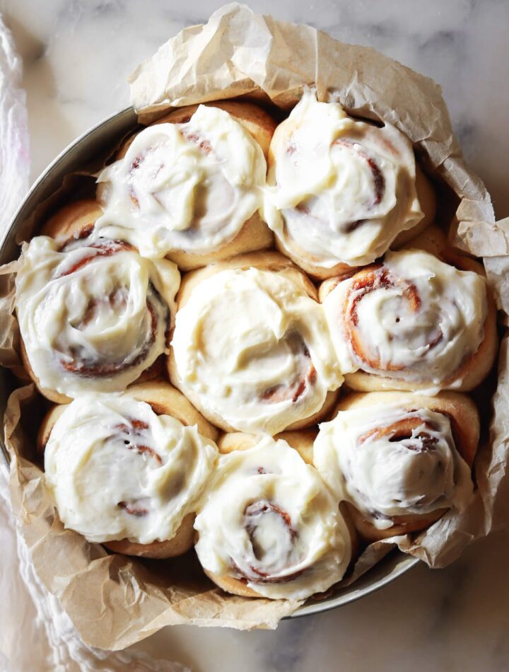 Spread the frosting over the rolls while they’re still slightly warm so it melts into all those layers.