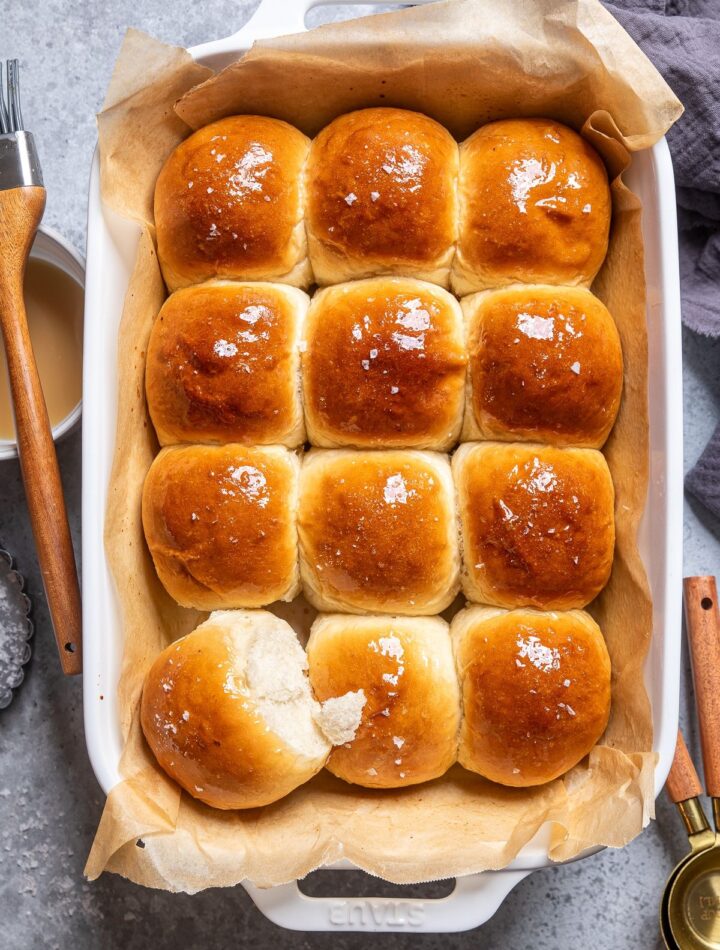 Arrange the rolls seam-side down in a greased baking dish or on a lined baking sheet. Space them slightly apart for soft, pull-apart rolls, or farther apart for individually crusted rolls.